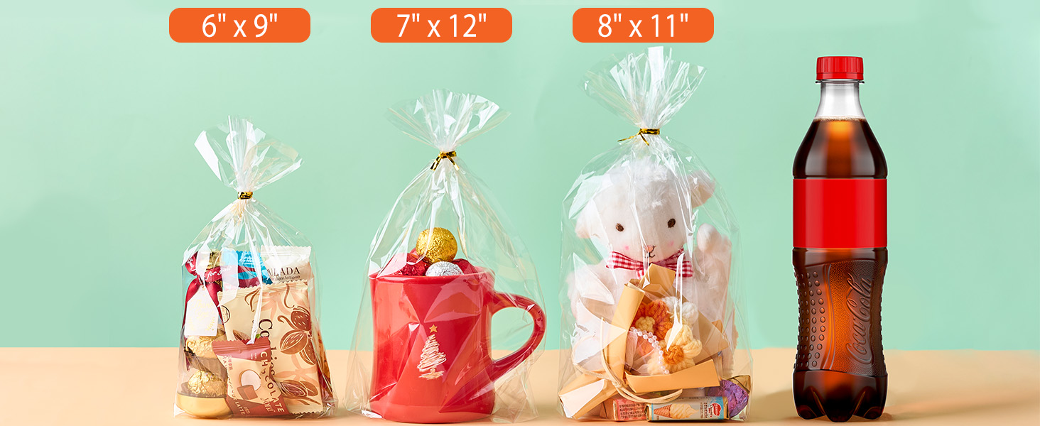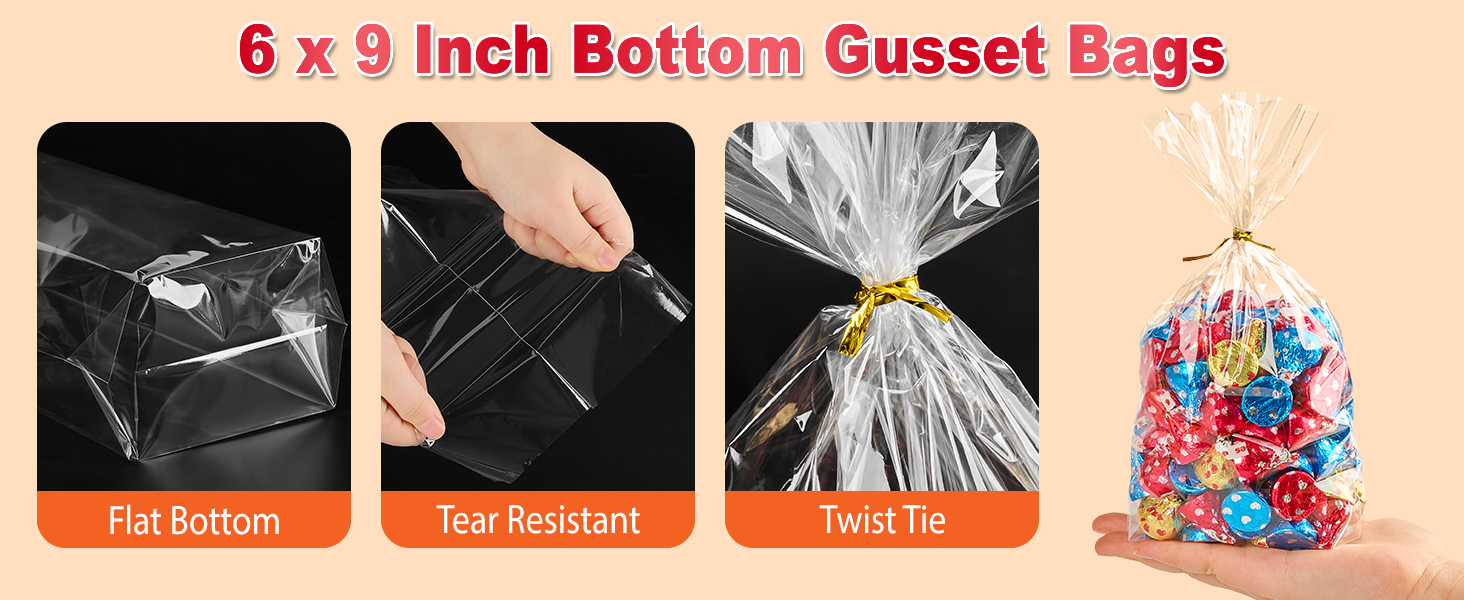 2.4” Wide Bottom Gusset: These clear goodie bags with ties have a wide flat bottom, which provides more storage space and can easily stand up to make the display more attractive